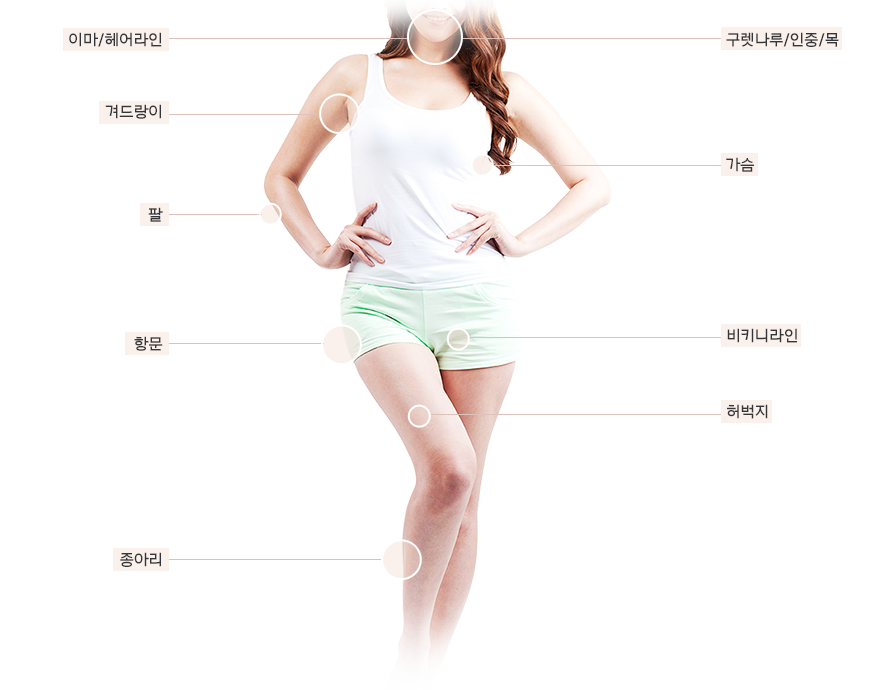 겨드랑이, 얼굴(이마, 인중,턱, 구렛나루 등), 팔, 종아리, 허벅지, 비키니라인, 항문) |