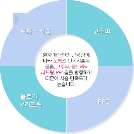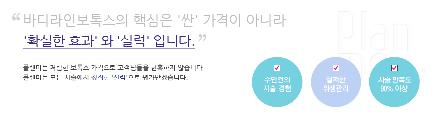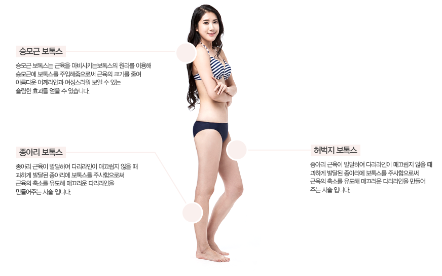 감퇴시키기 때문에 근육이 상대적으로 발달되는 승모근과 허벅지, 종아리에 주사할 경우 아름다운 몸매라인을 만들 수 있게 됩니다. 수술을 하지 않아 시술부담이 적으며 빠른 일상복귀가 가능하므로 바쁜 직장인들도 불편함 없이 시술 받을 수 있습니다.