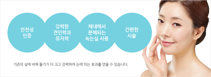 흡수성 PDO실 중 국내 유일한 안면조직 고정용 실로 허가인증을 받았으며 리프팅 유지기간을 장기화 할 수 있는