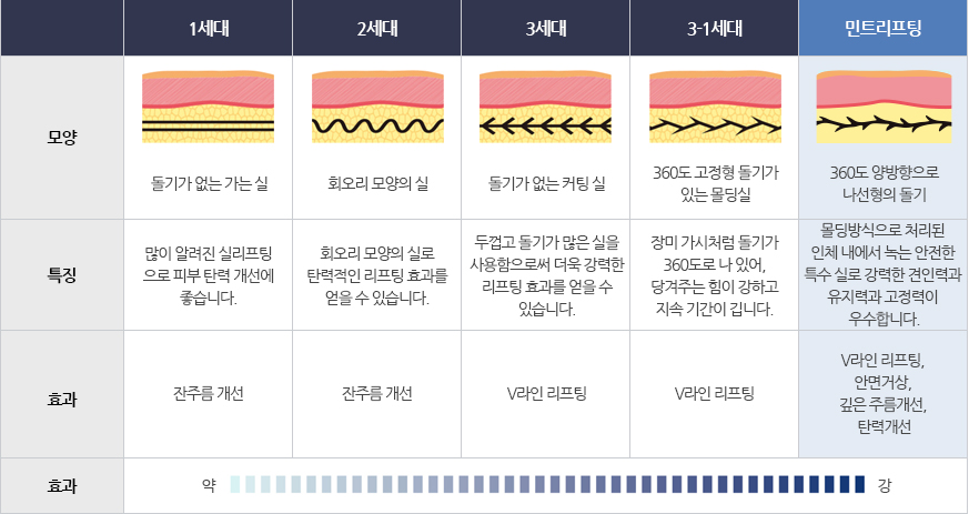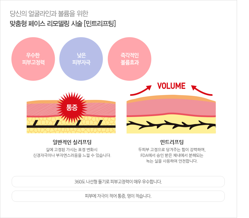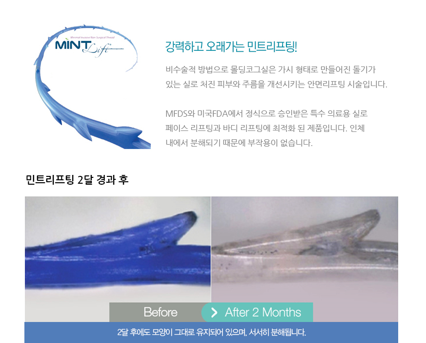 체내에서 분해되고 돌기가 있는 특수실을 피부에 삽입하여 쳐진 피부와 깊은 주름을 올리고 얼굴 전체에 탄력과