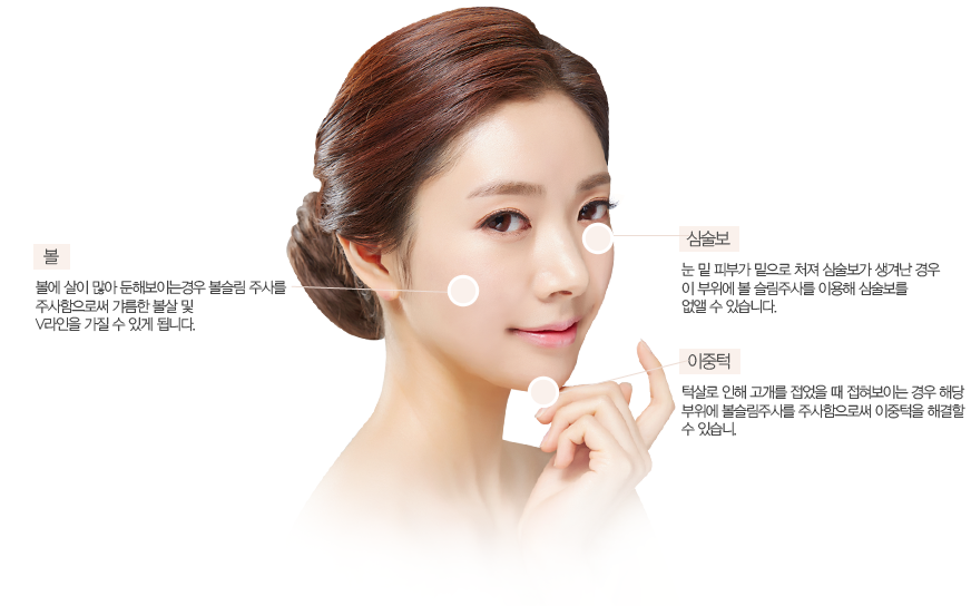 간단한 주사요법을 이용해 얼굴에 있는 지방을 줄여 슬림하고 갸름한 얼굴라인을 만들어 드리는 시술 방법입니다. 이중턱이나 심술보 그리고 볼살의 경우 특히 지방으로 인해 살이 쳐지거나 둔해 보이는 인상을 줄 수 있는데요. 이를 완벽히 해결해 줌으로써 기존의 윤곽주사보다 더 확실한 라인을 만들어 드릴 수 있습니다.