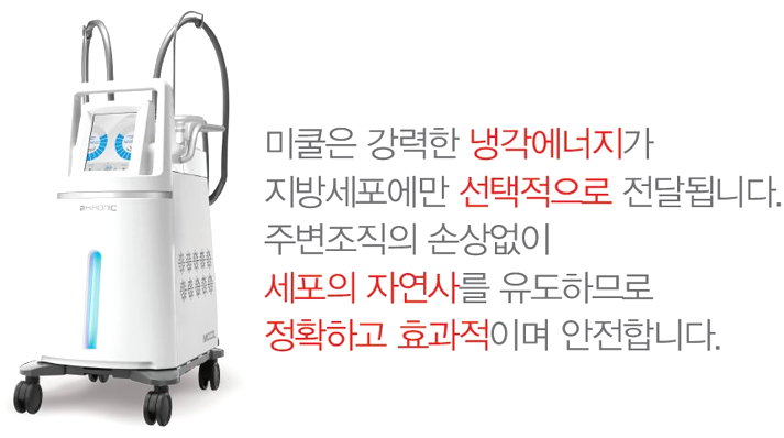 미쿨은 강력한 냉각 에너지가 지방세포에만 선택적으로 전달되어 지방세포의 자멸사(Apoptosis)를 유도하여, 지방층을 감소시키는 시술입니다. 특수 제작된 Smart Gel Pad를 사용하여 주변조직의 손상 없이 지방세포의 선택적 자연사를 유도하므로 미쿨(MICOOL)은 매우 효과적이며 안전합니다.