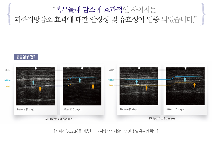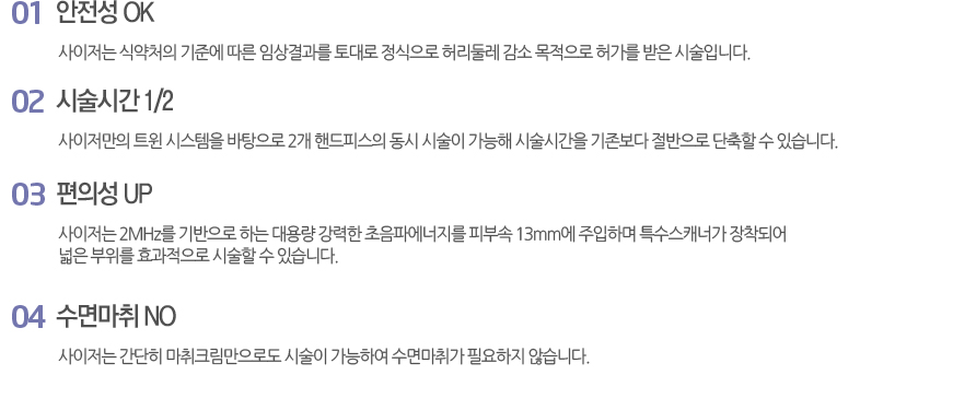 사이저는 2MHz를 기반으로 하는 대용량 강력한 초음파 에너지를 피부속 13mm에 주입하며 특수스캐너가 장착되어 넓은 부위를 효과적으로 시술할 수 있습니다. 특히 복부둘레 감소에 효과적입니다.