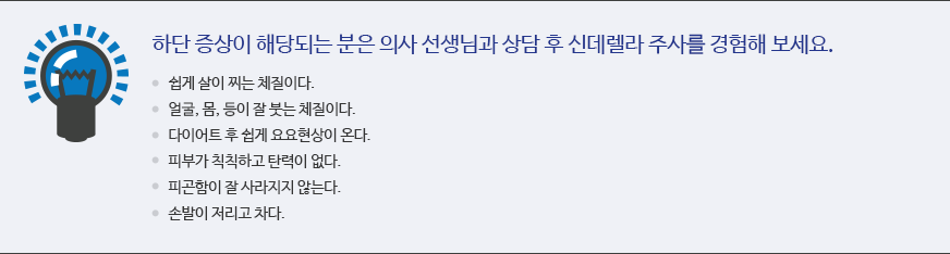 몸이 쉽게 피로해지거나 개운치 못하고 피부가 푸석푸석해지며, 스트레스가 쌓이는 원인은 바로 활성화 산소가 축척 되기 때문인데, 신데렐라 주사는 우리 몸의 독소, 즉 활성화 산소를 없애주는 치료의 대표적인 주사요법입니다.