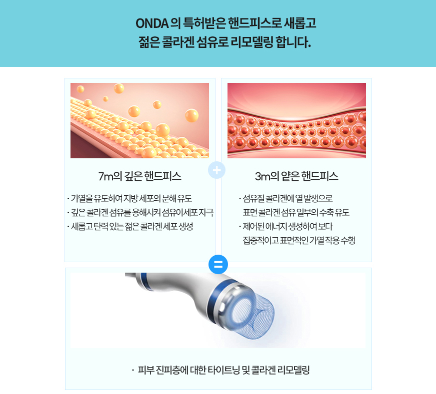 이탈리아 DEKA사에서 개발한 신개념 리프팅 (ONDA)온다 리프팅은 기존의 고주파(RF)나 초음파(HIFU) 방식을 뛰어넘는 극초단파(Microwave)를 이용한 방법으로 피부 탄력에 필요한 콜라겐을 리모델링 합니다. 강력한 접촉방식의 냉각과 지속적인 피부온도 모니터링을 통해 마취없이 편안하게 시술 받을 수 있습니다. 필요한 부위에 에너지를 선택적으로 전달하여 피부 탄력에 필요한 콜라겐을 지속적으로 장기화하여 리프팅 및 타이트닝에 보다 효과적입니다.