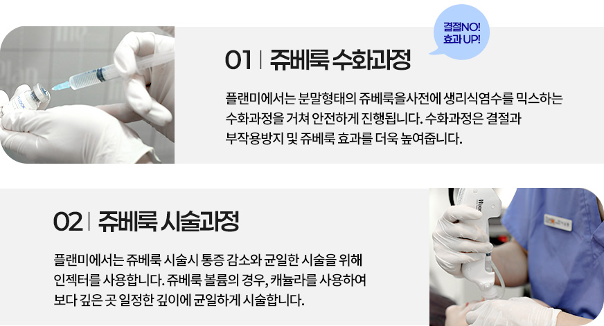 쥬베룩은 고분자 PLA + HA (히알루론산)으로 구성되어 피부 속 수분을 채우고 피부의 자가조직을 재생하고 콜라겐의 생성을 촉진시켜주는 스킨부스터 시술입니다.